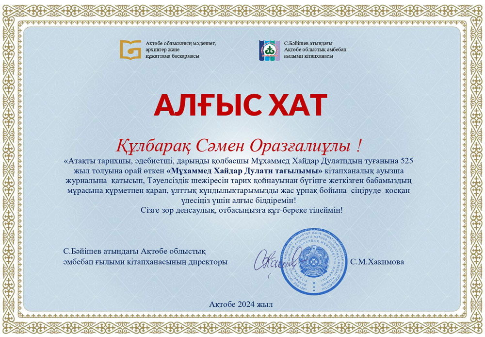 Осыған орай, кітапхана қызметкерлері Қ.Жұбанов атындағы өңірлік мемлекеттік университеті, тарих ғылымдарының кандидаты, аға оқытушы Еспенбетова Айнагүл Мейрамбекқызы, Ә.Кекілбаев атындағы №72 ЖББО ІТ мектеп-лицейінің тарих пәні мұғалімі, Республикалық “Үздік педагог-2020” байқауының жеңімпазы, “Қазақстанның әкелері” Республикалық әкелер қоғамдастығының құрылтайшысы, Алтынсарин төсбелгісінің иегері Тобылбаев Еркін Теміржанұлының қатысуымен «Мұхаммед Хайдар Дулати тағылымы» кітапханалық ауызша журнал өткізді.